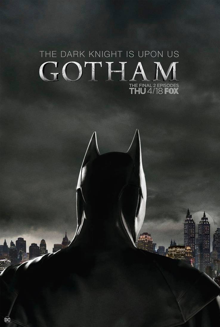In anticipation of that long-awaited final episode, Fox's official Twitter account has released a brand new poster showing the familiar rear profile of the show's Batman - pointy ears and all. Featuring the tagline "The Dark Knight is upon us," the poster showcases a little of Mazouz's Batsuit, as his now grown-up superhero surveys Gotham City from above.